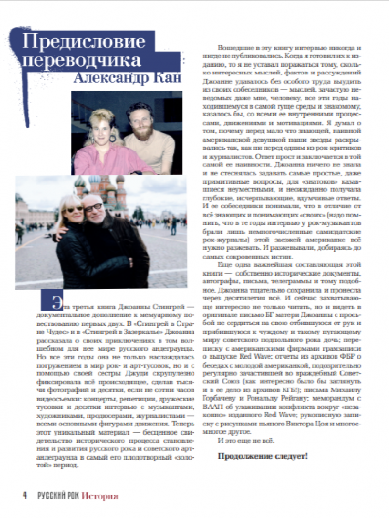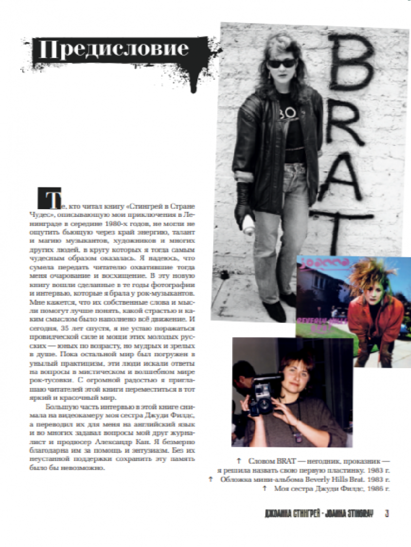 Автор книги-альбома Джоанна Стингрей – американская певица, актриса, музыкальный продюсер и общественный деятель, одна из значимых персон и популяризаторов советской и постсоветской рок-культуры на Западе. Джоанна много раз приезжала в СССР в 1980-х годах, подолгу жила в стране, была знакома с культовыми советскими рок-музыкантами — Борисом Гребенщиковым, Виктором Цоем, Константином Кинчевым, Сергеем Курёхиным, Гариком Сукачевым, Вячеславом Бутусовым, сотрудничала с ними. Она скрупулезно фиксировала все происходящее, сделав тысячи фотографий и сотни часов видеосъемки: концерты, репетиции, интервью с музыкантами, художниками, продюсерами, журналистами. Теперь этот уникальный материал — бесценное свидетельство исторического процесса становления и развития русского рока и советского арт-андеграунда в самый его плодотворный "золотой" период. Все материалы в книге публикуются впервые.